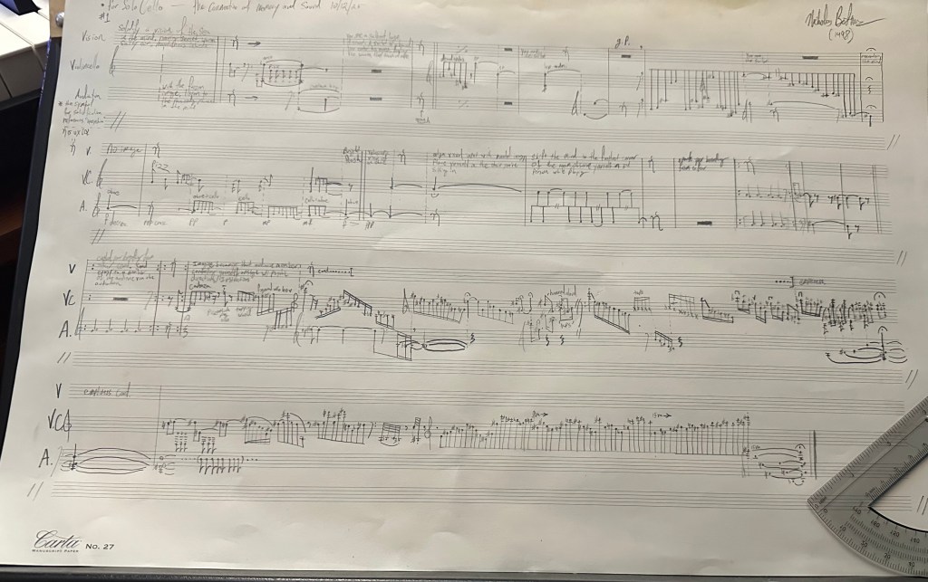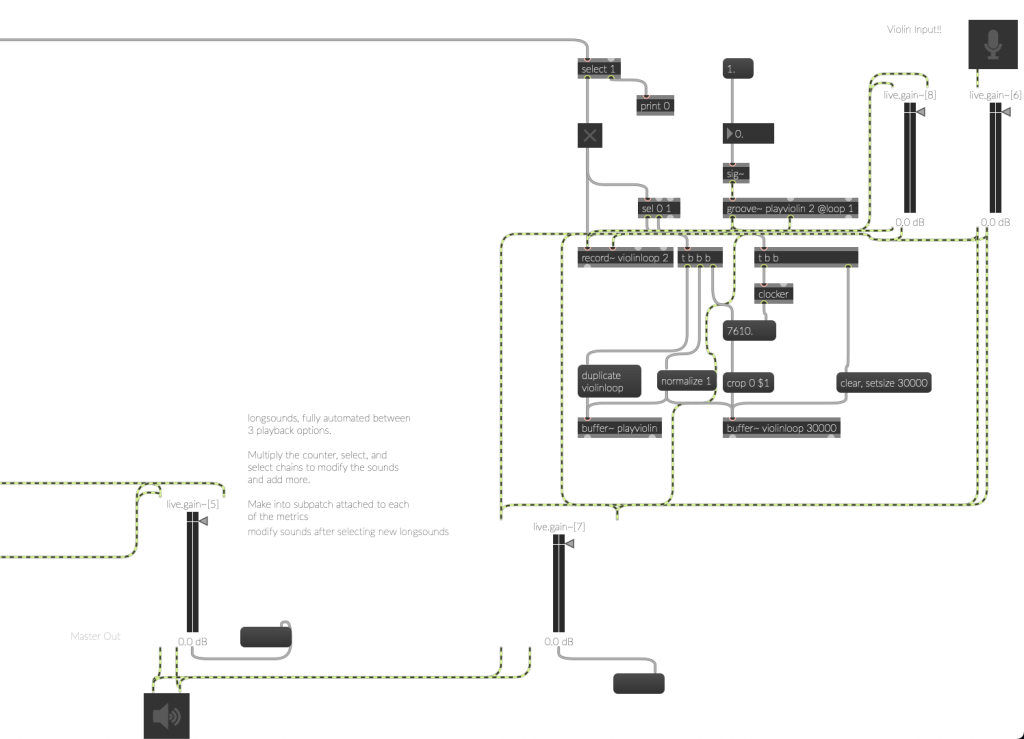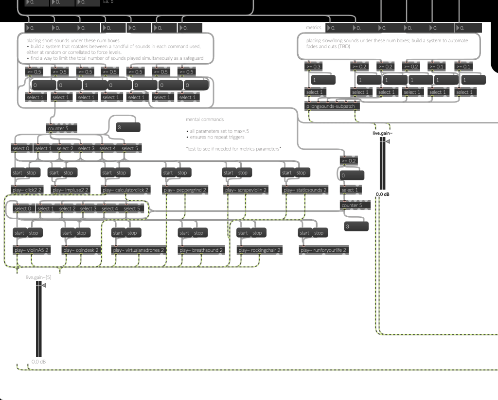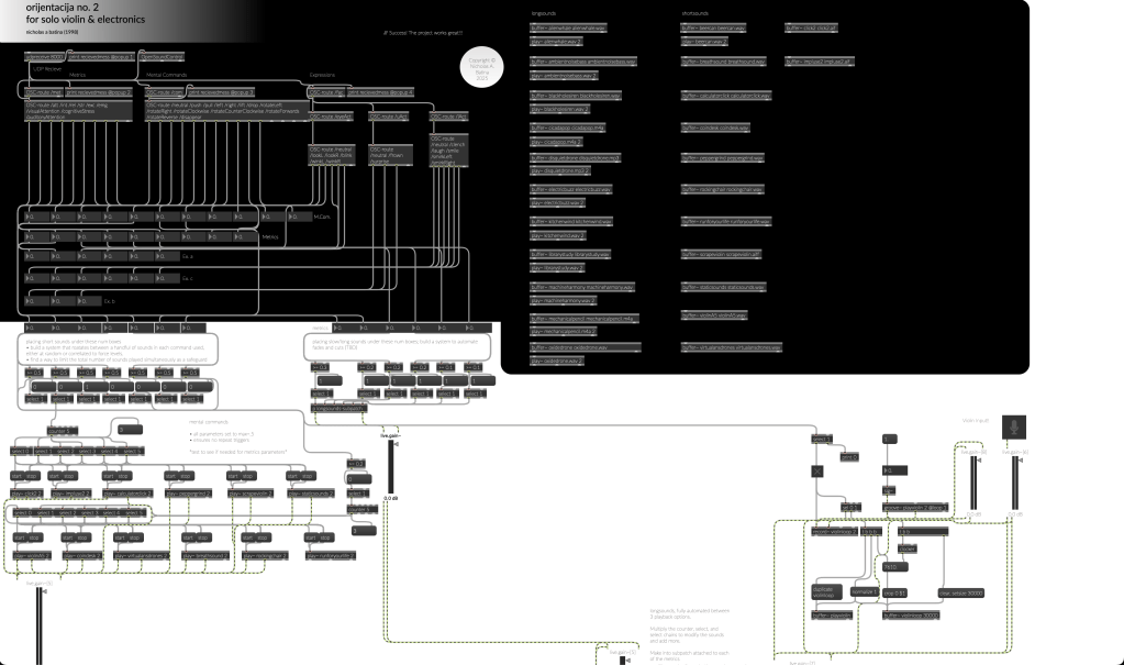 In orijentacija 2, a player engages in visualizations, controlling mental commands which are programmed to trigger sounds inside a Max patch, partly repurposed from orijentacija 1. In addition, a realtime stream of energy levels across many brain frequencies are triggering sounds as they reach a certain threshold of intensity. As a fairly traditional concert violinist myself (keeping my composition and performance lives well separated, as opposed to fused), I have always been fascinated by my violin professors’ suggestions to visualize a scene while performing, often leading to very elaborate descriptions of nature, locations, out-of-body experiences like picturing oneself performing from the end of a hall, and more. This side of performance is mostly hidden from listeners, and I like to imagine that the act of composition allows an audience to peek inside the inner world of composers from across time, with the quality of a performance correlating to a performer or ensemble’s ability to convey that inner world to a listener. My goal for orijentacija 2 — and the subsequent • for [solo instrument] series — is to place that internal world of a player or performer directly on stage as a duet partner.
